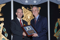 Above, Deputy Secretary of Defense Gordon England (right) presents the Secretary of Defense Community Drug Awareness Award (Best Program In the U.S. Navy) to Kings Bay's representative, Neil Guillebeau, community relations manager, (left), during the Pentagon's Red Ribbon Week opening ceremony in October 2006. The base also won the award in 2007.